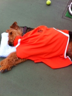 久し振りにJ君、久地に登場! 久し振りにJ君が久地の240テニスカレッジに登場! Jは可愛いのだが、彼が来ると花を食べたり、気に食わないと吠えたり、もちろん練習を突然ストップさせるほどコートを走り回ったりで本当に大変。 今日はあまりのはしゃぎぶりで、俺の大切なウェアーを毛布代わりにテニスコートでちゃっかり爆睡! 全く憎めない可愛い訪問者であった。