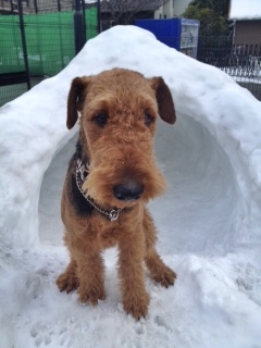 テニスコートに積もった雪で作ったカマクラで大はしゃぎするジェイを写メしました。