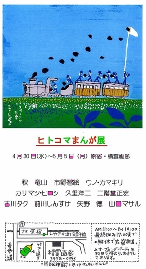 ヒトコマまんが展 おやつはカールのコマーシャルで一世を風靡した山口マサルさんからヒトコマまんが展の案内が届いた。 僕は、昔から山口さんの何とも言えないマンガのタッチが大好きであった。 時間があったら、是非行きたい!