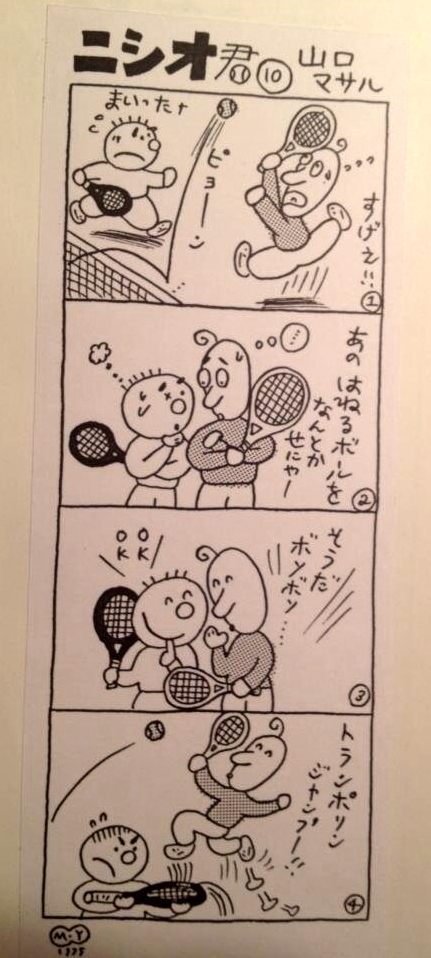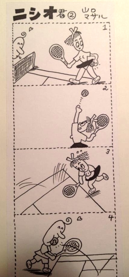 山口マサルさんからのプレゼント 漫画家の山口マサルがメールを送ってくださった。 山口マサルさんは、明治製菓の「おやつはカール」のコマーシャルで一世を風靡した漫画家でもある。 その山口さんはテニス愛好家でもあり、以前 僕が作っていたテニスサークルにも参加して下さっていた。 会報に「ニシオくん」という4コマ漫画を無償で書いて下さっていた。 その時の4コマ漫画を私に送って下さった! 凄いでしょう!!!