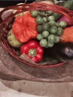 玄関に、お盆ウイークということで?ワイフが籐の籠の中にぶどうやピーマン、ほうづき等を駆使してディスプレイしたものがコレ!
