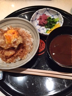 かき揚げ天丼に、卵の天ぷらをのっけて食べると美味しいよ。