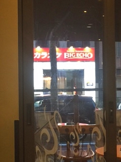 仕事の前のコーヒーブレイク 仕事の前のコーヒーブレイク中に撮ったワンショット。 コーヒーを飲みながら、室内から外に向けて撮ったもの。 カラオケ屋さんが道路を隔ててしっかり写っている。 そう言えば、最近全くカラオケ屋に行っていないヨ!