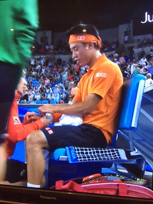 また、手首を少し痛めているようで、第1セットを取った時点で、インジュリータイムを取って、治療をした。