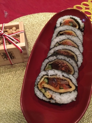 節分 今日は節分! 豆をまいて「邪気を払う」と言うセレモニーを行い。 神様がいる方向を向いて、恵方巻きを願いを込めながら、無言で食べる。 俺にはとても難しい行動だ。 でも、イベントだから、我慢! 今年は南南東の方角であった。