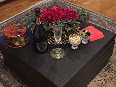 今日はワイフがリビングのテーブルに真っ赤なダリアとユーカリで大胆なアレンジ。