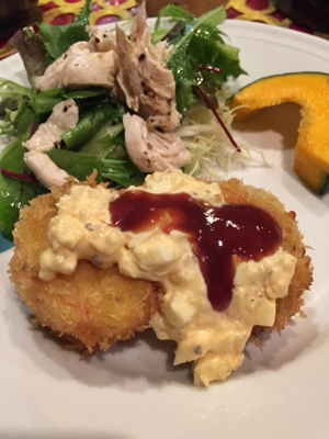 今晩の我が家の夕食は、大好きなエビフライ、サラダ、豆腐、味噌汁等であった。