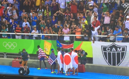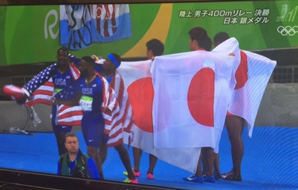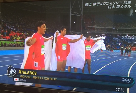 日本の男子が400メートル リレーで、ジャマイカの次、2位。