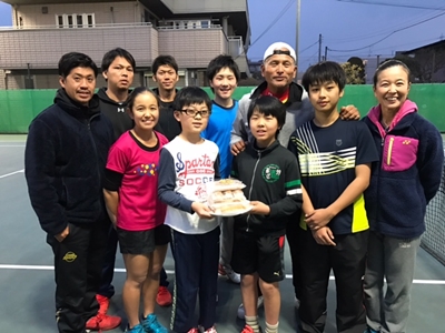 コウヤ、トウイ、ケン卒業おめでとう! 240テニスカレッジのトーナメントクラスの小学校を卒業した3人を、トーナメントクラス、スタッフ全員で祝った。 トウイがまだインフルエンザで、テニスコートに来られなかったのが残念であった。