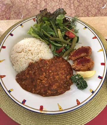 キーマカレーと豚のアスパラ巻きフライとサラダ。