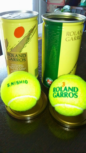 ローランギャロスのボール 株式会社ダンロップがローランギャロスのパテントを買っていた時期があった。 皆はもう覚えていないかもしれないが、ダンロップは「ローランギャロス」と言うラケットも販売していたし、僕も 一時的に使っていた。 以前僕はダンロップと契約していて、このローランギャロスのボールにもNISHIOのネームのロゴを入れて使っていた。 「実家を整理していたら、このローランギャロスのボールが沢山出て来た。」と姉から連絡があり、写真も送って来てくれた。 懐かしい....