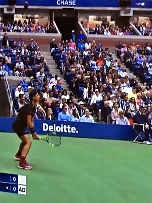 あの広いアーサー アッシュ スタジアムのセンターコートでしか見られない、ナダルの最後方に下がってのレシーブの位置。