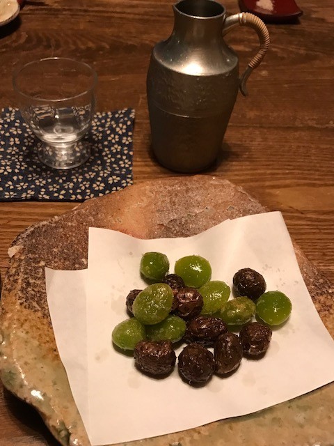 秋の味覚、銀杏とむかごの素揚げを日本酒と共に頂いた。