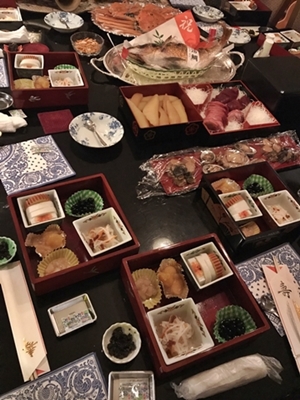 デビ夫人を囲んでの新年会 ホキ徳田さんのお店に集合し、デビ夫人を囲んでの新年会を行なった。 デビ夫人が手作りのお重を持参し、お店でお雑煮まで振舞ってくれた。 それがまた 大変美味しく、会のムードもぐっと盛り上がった。 我々はシャンパンだけを持って行けば良いと聞いていたので、恐縮した。 デビ夫人って、本当に女性らしい方なんだと、つくづく思った。