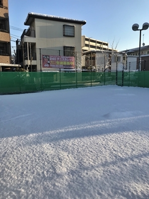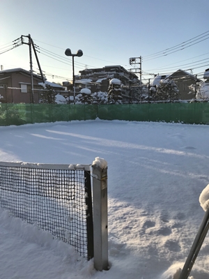 テニスコートは白一色 久地のテニスコートに雪が積り、テニスどころではなくなってしまった。 スタッフが総出で雪掻きをし、夜になってようやく明日テニスコートが使える状態になった。 本当に大変だった。 皆、本当にお疲れ様!