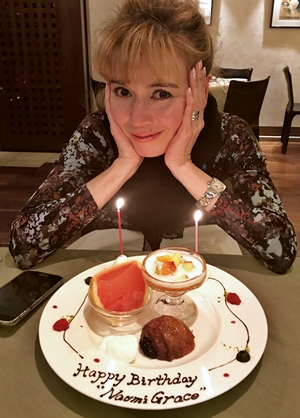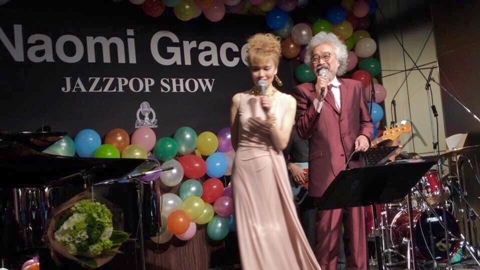 ナオミ・グレースのバースデイ・ライブを終えて、ご主人の進さんがバースデーケーキを前にしたナオミの写真と、ワイフと僕が彼女にプレゼントしたお花の写真を送ってくれました。