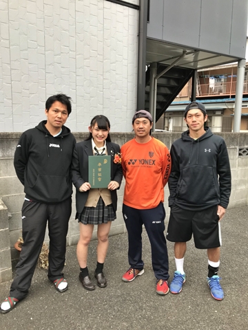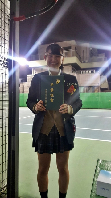 トーナメントクラスの萌乃が卒業 トーナメントクラスの萌乃が無事高校を卒業。 卒業証書とともに240テニスカレッジに顔を出した。 小さい時からずっと面倒を見てきたので、感慨深い。 卒業、心からおめでとう!