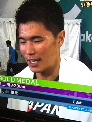 アジア大会男子200メートル 日本の小池がアジア大会、陸上男子200メートルで金メダルを取った。 初代表で自己ベストのタイムで見事優勝した。 タイトルを取ることはなかなか難しい。 それは大昔の事ではあるが、僕もタイでのアジア大会に出場。 テニスの男子 シングルスでもう少しで金メダルというところで、インドネシアのウイジョノに負け、銀メダルに終わったことを思い出した。 簡単に金メダルというが、アジア大会と言えど、なかなか金メダルは取れない。 小池選手、おめでとう!
