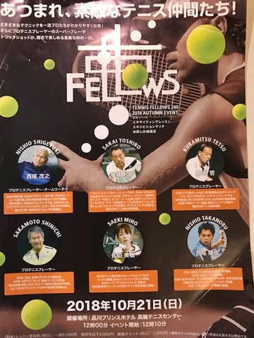 第11回フェローズ開催 毎年10月の第3日曜日 、元全日本チャンピオンたち、坂井利郎さん、倉光哲さん、坂本真一さん、佐伯美穂さん、息子の西尾隆信、そして僕でイベントを開催します。 テニスが大好きな人、興味のある方、是非お集まりください。 10月21日 (日) 12:00~ @品川プリンスホテル高輪テニスセンター お問い合わせは 240テニスカレッジまで Tel 044‐935‐0502 mail teamnishio@aol.com 詳細はこちらから