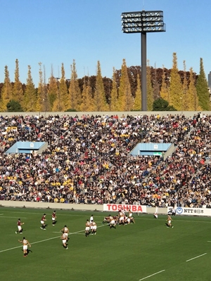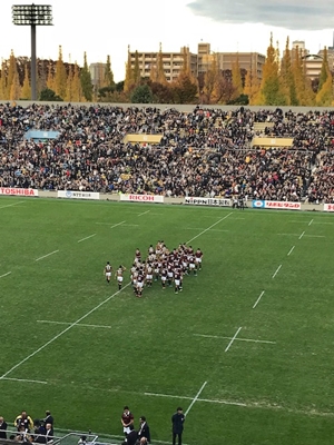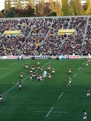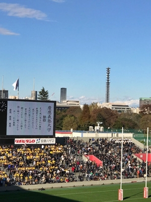 ラグビー早慶戦 11月23日は 毎年ラグビーの早慶戦と決まっているらしい。 早稲田大の先輩の藤原さんがチケットを取って下さり、観戦しに行った。 試合が始まる前に 早稲田大の校歌、慶応大の校歌を歌い、否が応でも気持ちが盛り上がる。 結果は戦前の予想を覆し、早稲田の圧勝。 満足感一杯の一日となった。