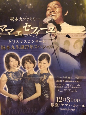 坂本九ファミリー クリスマスコンサート 坂本九さんはテニスが大好きだった。 お仕事をご一緒させて頂いた事がきっかけで親しくなり、 僕達の結婚式でも歌って下さった素敵な思い出がある。 今年は坂本九 生誕77年記念。 毎年恒例の母娘のママ エ セフィーユも、心温まる素敵で特別なコンサートだった。