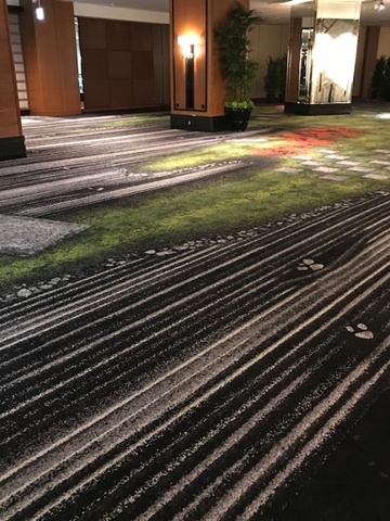 ホテルニューオータニの床 ホテルニューオータニの床に敷いてある絨毯が以前とは変わっていた。 まるで京都の石庭のような、庭のイメージなんだろうか? もちろん、自然とは比較にはならないが、「外国人は喜ぶだろうな?」と思った。 じっくり見てみると、なかなか素敵だ。