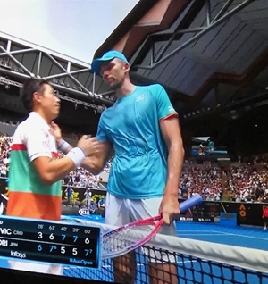 錦織辛くも3回戦へ 2m11cmのカルロビッチのサーブに錦織は本当に苦しんだ。 錦織は6-3.7-6.5-7.5-7.7-6のスコアで辛くも3回戦に進んだ。 特に第5セット4-4の錦織のサービスゲーム、0-40の大ピンチをしのいだ事が勝利につながった。 錦織は1回戦、2回戦とも5セットで勝利したので、体力もキツイと思うが、3回戦から更に頑張ってくれると思う。 テニスは決して悪くはない! 頑張れ、錦織。