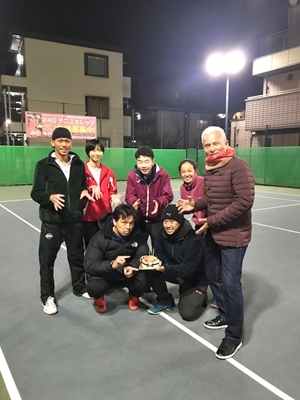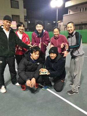 赤土と隆信の誕生日祝い 2月5日は 赤土と隆信の誕生日であった。 2人が揃った今日、トーナメントジュニア、スタッフと誕生日を祝った。 2人の名前を書いたクッキーをショートケーキの上に載せて、ハッピーバースデーの歌をテニスコートで高らかに歌い、セレモニー終了!