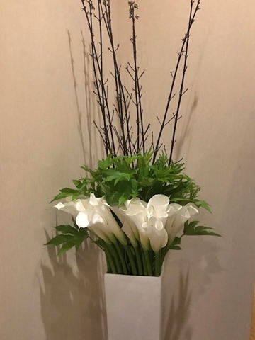 我が家の玄関に、カラーと木苺の枝がディスプレイされていた。