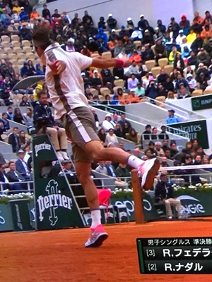 ナダルが強い! ナダル対フェデラーの試合は、とても見応えがある試合であった。 フェデラーの攻撃をことごとく凌ぎ、攻撃的なストレークでフェデラーにミスをさせてしまうナダル。 また、フェデラーのミスに乗じて強力なストロークでエースを放つナダル。 今日のナダルは「クレーコートのチャンピオンは俺なんだ!」と、王者の力を見せつけた感じであった。 僕はジョコビッチが優勝すると予想したが、今日のナダルを見てしまうと、気持ちが揺らいでしまう。 それ位、今日のナダルは強かった。