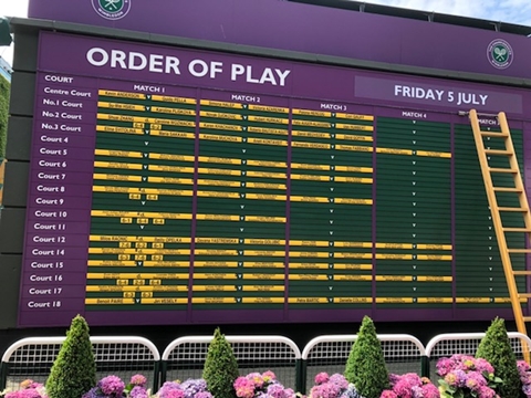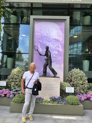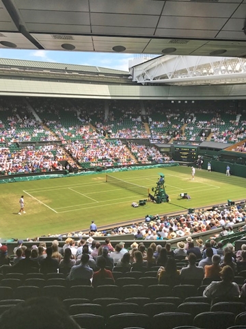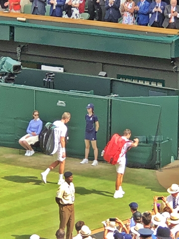ウィンブルドンのセンターコートへ センターコートの第1試合、昨年準優勝 南アのアンダーソン対アルゼンチンのペラの試合を観戦。 ペラはストローカー。 「アンダーソンに勝つのは、なかなか?」と思っていたら、第1、第2セットを簡単に取り、いつのまにかペラペースに。 最後はタイ ブレイクをものにし、6-4.6-3.7-6で大金星。 ペラのアンダーソンに果敢に立ち向かって行く姿に、家内は泣いていた。 それくらい素晴らしい試合であった。