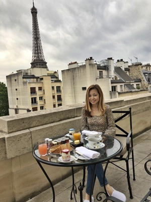 パリ最後の朝食は、エッフェル塔を眺めながら、テラスで...