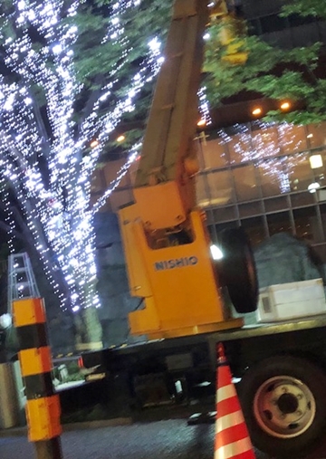けやき坂のライティングの取り付け まだ暮れではないが、けやき坂ではもうライトアップのセッティングをしていた。 クレーン車を使って、工事をしていた。 何と、そのクレーン車にNISHIOと会社の名前が表示されていた。 ついつい写真を撮ってしまった。 本当に驚いた!