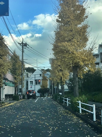 銀杏の木から色づいた葉が落ちて、道路は黄色い落ち葉で一杯。