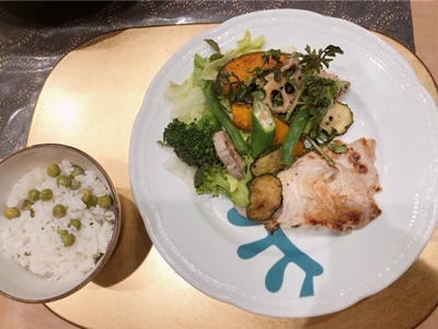豚の生姜焼きと豆ご飯、味噌汁が今夜の夕食。