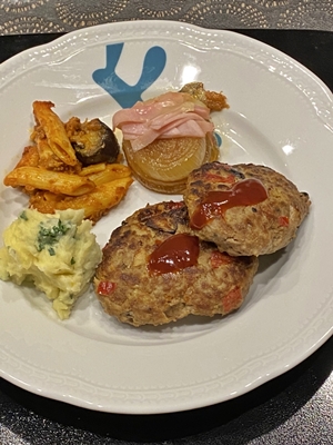 ハンバーグ、マッシュポテト、ナスとモッツァレラのペンネ、新玉ねぎのハムとチーズ乗せ。