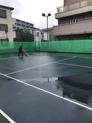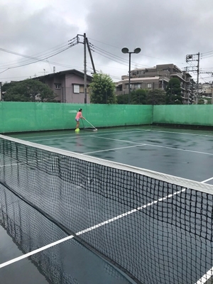 又、又、又、雨… 1日に何度、コートの水捌けをすれば良いのだろうか?? 朝早く起きてテニスコートに向かい、雨が止むのを待つ。 仕方ないけど、嫌になる時もある。 でも、生徒さんがテニスをすることを楽しみにしていることを考えれば、そんな事も言ってられない。 明日も雨模様… 頑張らなきゃね!
