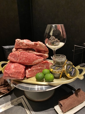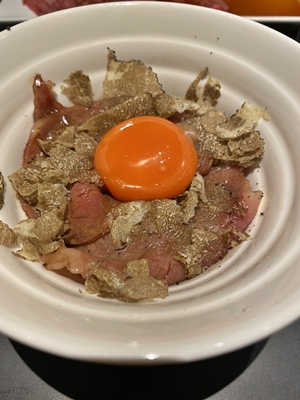 仕上げは、ご飯に焼いたカルビをのせ、卵とトリュフをかけて食べる。