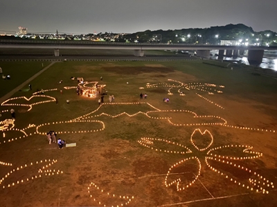 子供たちが、多摩川の河川敷で、ライトを使いアートを作っていたとか?!