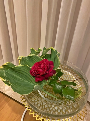 大きめの平な花器に、観葉植物の葉と共に浮かべています。
