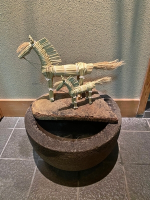 ある料理屋の玄関に藁で編んだ馬が飾られていた。