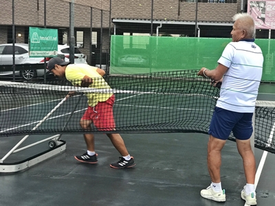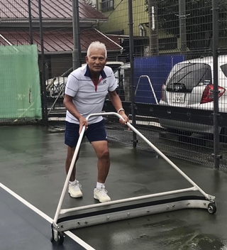 水捌け 今日も天気が不安定で、レッスンの途中から雨が降り始めた。 しばらくして雨は止んだが、僅かではあったが水溜りが出来たので、水捌け作業。 結構キツイんだよね! でも30分後にはテニスが出来、皆、大満足。