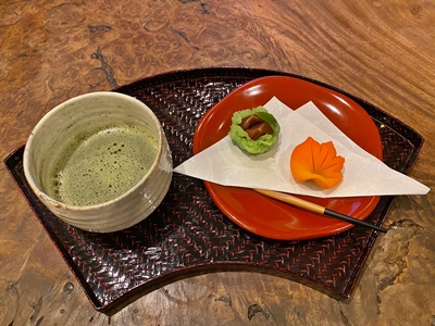 二つ食べちゃいました 今日のデザートは、季節感たっぷりの美味しそうな和菓子。 甘い物が大好きな僕は「太るかも?」と思いながら、二つ食べちゃいました。 和菓子と抹茶はしっかりとマッチして、本当に美味しかった。