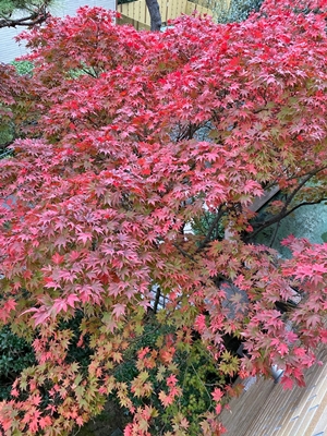 マンションの入り口にモミジがあり、いつの間にか、こんなに赤く美しく紅葉していた。