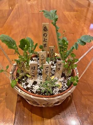 七草粥と雪化粧 昨日の雪で、外は雪化粧。 又、今日1月7日は七草粥。 一年の最初の節句である。 七草粥を食べることで、邪気を払い万病を除く、と言い伝えられています。 春の七草には体に溜まった老廃物を排出する栄養素が含まれていることから、お正月で疲れた胃を休め、不足しがちな栄養を補うとも言われていますよ。