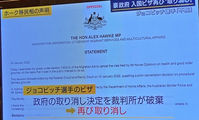ジョコビッチの出場は? ジョコビッチのビザが再び取り消しになったらしい。 ジョコビッチは再度裁判所に提訴、日曜日の朝、決定が出るそうだ。 その決定で、明日から始まるオーストラリアンオープンにジョコビッチが出場出来るか否かが決まる。 本当に迷走するジョコビッチの出場。 一体どうなっているのかね? 明日から始まるオーストラリアンオープンにケチがつかないように願うばかりだ。