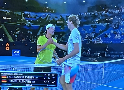 全豪オープンがスタート ジョコビッチが国外退去で、第1シード不在の中、全豪オープンが始まった。 男子1回戦、優勝候補の1人、第3シードのズベレフ対アルトマイヤーの試合。 ズべレフは、安定したサービスゲームで、アルトマイヤーを7-6.6-1.7-6のストレートで下した。 やはり、ジョコビッチが抜けた今大会、優勝候補の筆頭かもしれない。