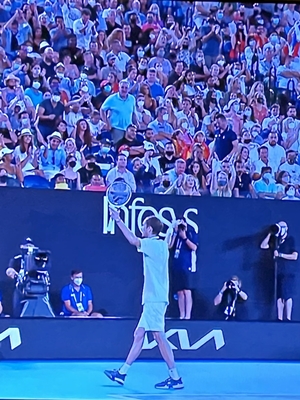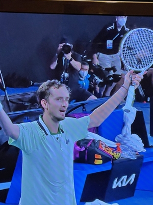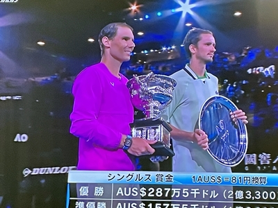ナダル優勝! メドベージェフの力強いサーブ、ストロークにナダルが押されて、2セットダウン。 しかし絶体絶命から、ナダルが諦めない精神的な強さを発揮。 ナダルが抜群の集中力で挽回して、21回目のグランドスラムのタイトルを奪った。 メドベージェフは、決して悪くはなかった。 本当に素晴らしい試合であった。 メドベージェフに、あと少しの運があれば勝てていただろう。 そんな素晴らしい試合であった。 ナダルから2-6. 6-7. 6-4. 6-4. 7-5 のスコアで優勝を飾った。 ナダル、本当に心からおめでとう!