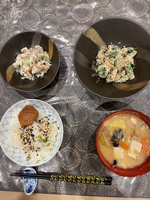 俺の夕食 膝や肘を痛め、少しダイエットしなければならない俺。 外食だと、どうしてもカロリー過多になる。 家で食べる時は、家内が栄養面をよく考えたメニュー作りをしてくれる。 ありがたい事だ。 今日の夕食、大好きな豚汁でカロリーとタンパク質を補える。 美味しかった!