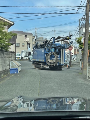 テニスコートに行く途中、僕の車の前にショベルカーが道を廻りきれずに立往生!